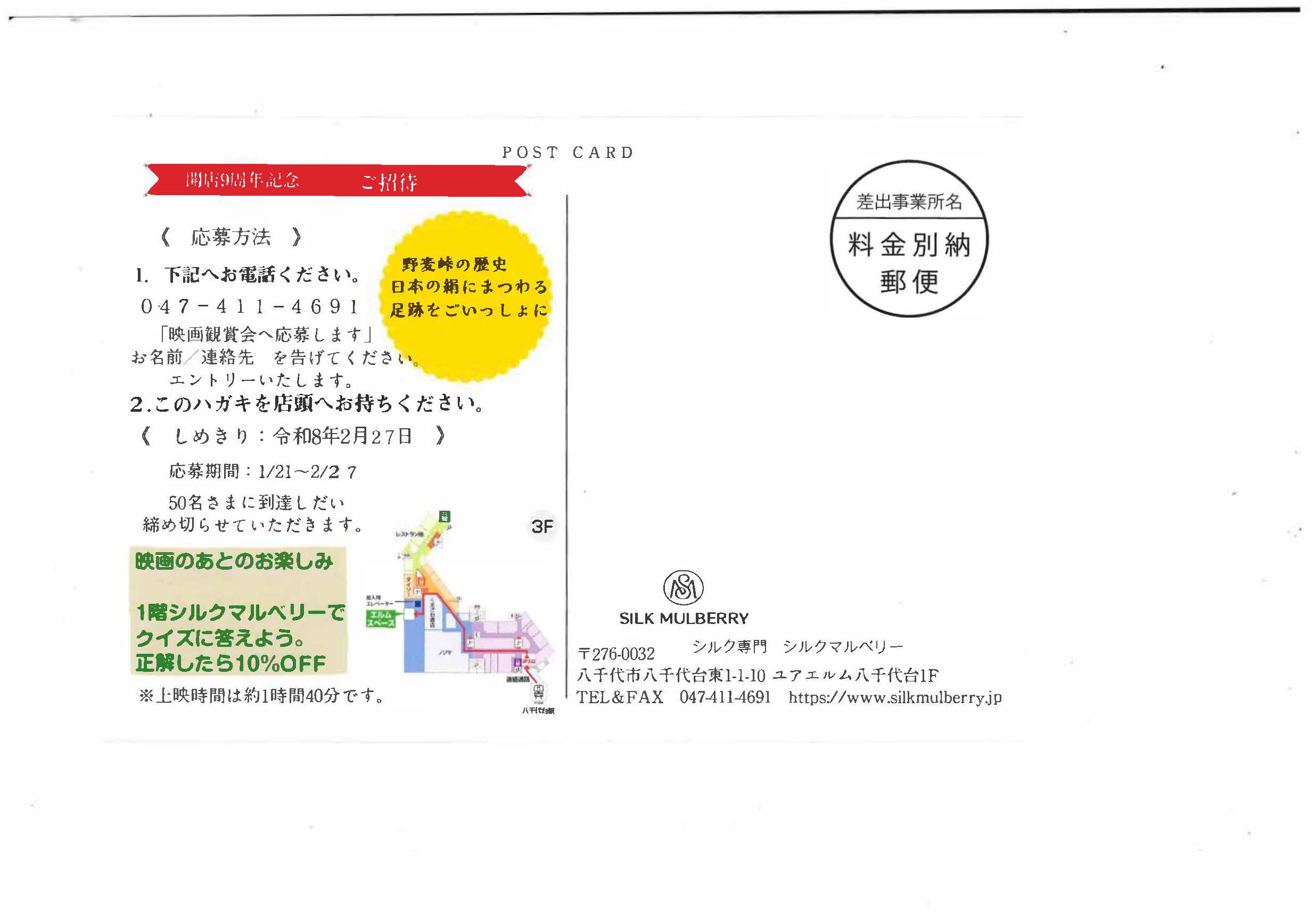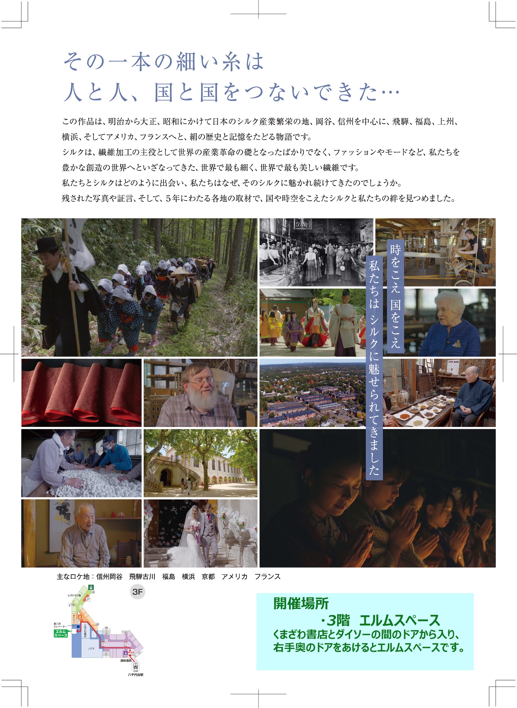 シルクマルベリー主催 特別上映会 2月28日(土) (千葉県八千代市) お知らせ 2026年2月10日 日時:2月28日(土) 午前10時30分から 場所:京成ユアエルム 八千代台 3階エルムスペース 主催:シルク専門店SILK MULBERRY 入場無料 先着50名様ご招待 (ハガキ持参でショップへ) 問合せ先:047-411-4691 (シルクマルベリー) https://www.silkmulberry.jp/